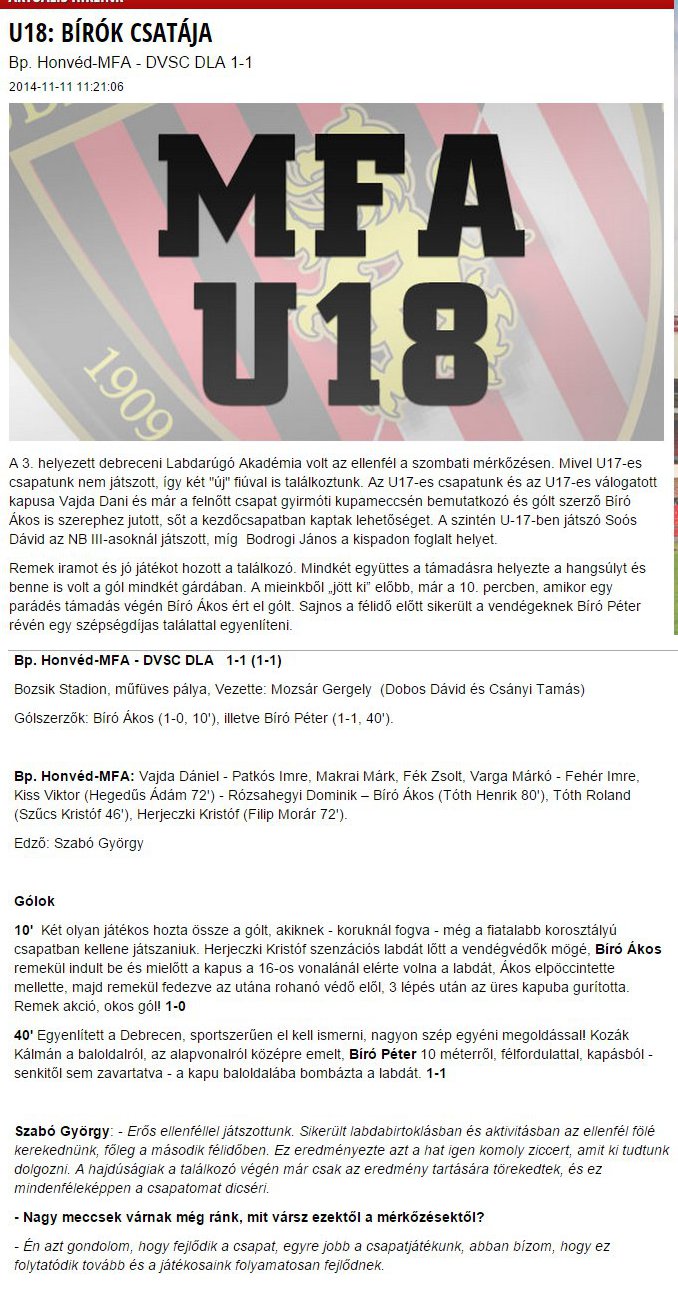 Honvéd online : Honvéd MFA- DVSC U18 1:1